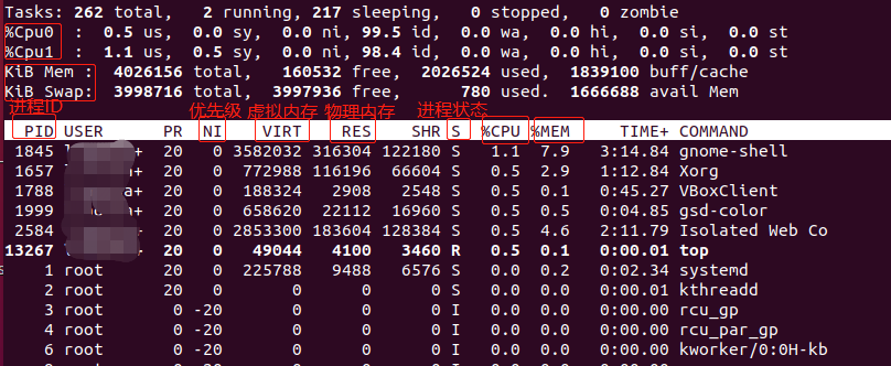 | CPU性能指标 | CPU使用率 | 用户CPU | 用户态CPU时间 | | 系统CPU | 内核态CPU时间 | | iowait | 等待I/O的CPU时间 | | 硬中断 | 硬中断CPU时间 | | 软中断 | 软中断CPU时间 | | 窃取CPU | 被其他虚拟机占用的CPU时间 | | 客户CPU | 运行虚拟机的CPU时间 | | 上下文切换 | 自愿上下文切换 | 自愿上下文切换,是指进程无法获取所需资源,导致上下文切换。比如I/O,内存等资源不足时就会发生资源上下文切换。 | | 非自愿上下文切换 | 非自愿上下文切换,是指进程由于时间片已到等原因,被系统强制调度,进而发生的上下文切换。比如 大量进程都在争抢CPU时,就容易发生非自愿上下文切换。 | | 平均负载 | 单位时间内,系统处于可运行状态和不可中断状态的平均进程数,也就是平均活跃进程数。 | | CPU缓存命中率 | 如果 CPU 所要操作的数据在缓存中,则直接读取,这称为缓存命中。命中缓存会带来很大的性能提升,因此,我们的代码优化目标是提升 CPU 缓存的命中率。 |