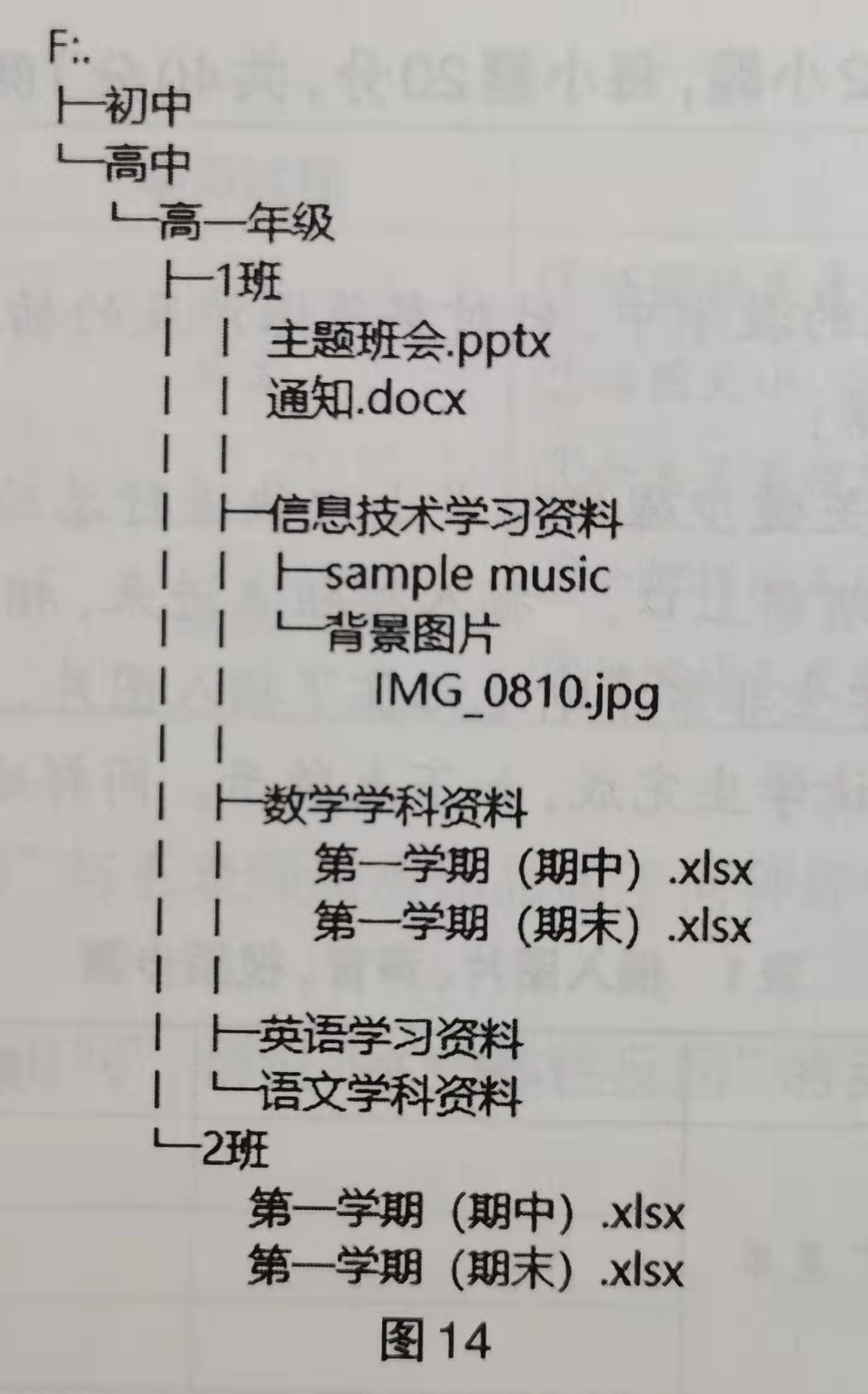 二、简答题(本大题共3小题,每小题10分,共30分) 16.根据图14的内容判断其属于操作系统的哪种文件目录管理方式,并简述该方式的优点。