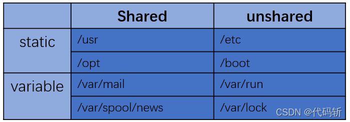 - 不变的(static),数据不会经常变动,如函数库,文件说明文件,主机服务配置等;