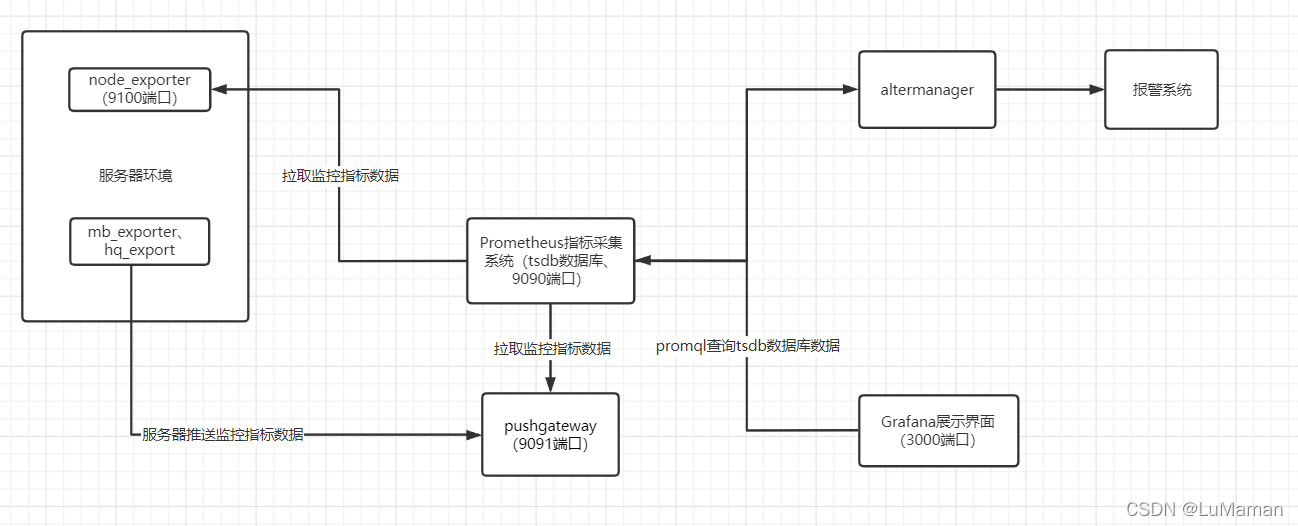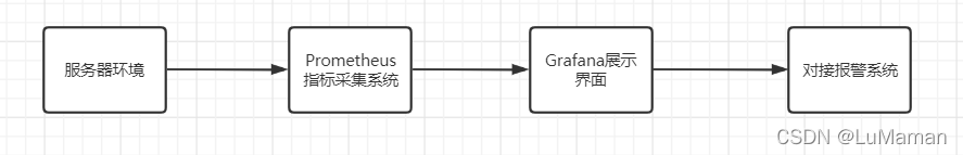 首先说明一下,Prometheus是对服务器基础硬件指标进行采集以及程序指标进行采集,Grafana是对指标进行展示(Prometheus当然也可以进行监控指标的展示,但是界面不是很友好,Grafana是专门展示监控数据的一个软件平台)。这里没有讲解报警对接的逻辑,后续有在补充一下。