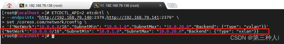 ETCDCTL_API=2 etcdctl \ --endpoints "http://192.168.79.140:2379,http://192.168.79.141:2379" \ set /coreos.com/network/config \ '{"NetWork":"10.0.0.0/16","SubnetMin": "10.0.1.0","SubnetMax": "10.0.20.0","Backend": {"Type": "vxlan"}}'