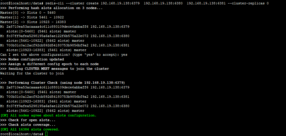 redis-cli --cluster create 192.168.19.138:6379 192.168.19.138:6380 192.168.19.138:6381 --cluster-replicas 0