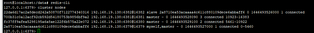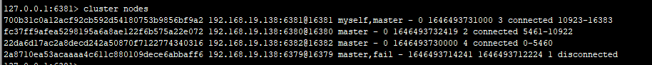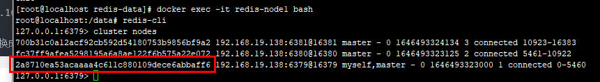 在node1中,执行redis-cli进入redis服务,查询集群节点状态cluster nodes