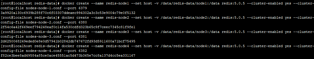docker create --name redis-node4 --net host -v /data/redis-data/node4:/data redis:5.0.5 --cluster-enabled yes --cluster-config-file nodes-node-4.conf --port 6382