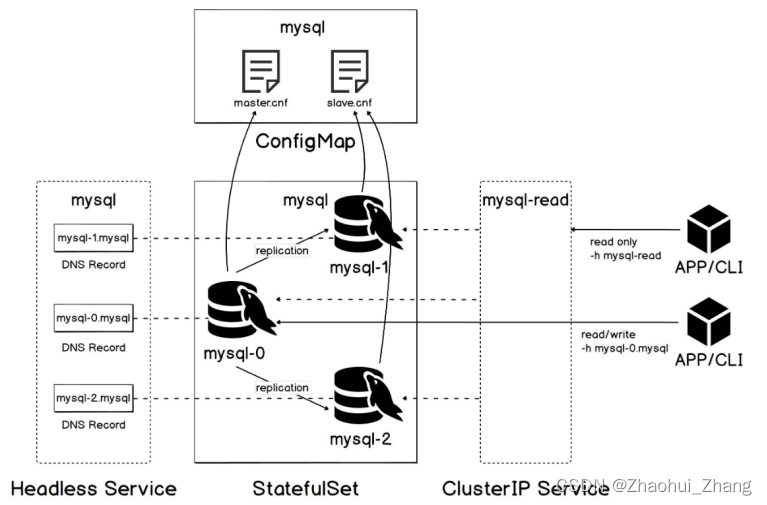 运行一个有状态的应用程序 | Kubernetes本页展示如何使用 StatefulSet 控制器运行一个有状态的应用程序。此例是多副本的 MySQL 数据库。 示例应用的拓扑结构有一个主服务器和多个副本,使用异步的基于行(Row-Based) 的数据复制。说明: 这不是生产环境下配置。 尤其注意,MySQL 设置都使用的是不安全的默认值,这是因为我们想把重点放在 Kubernetes 中运行有状态应用程序的一般模式上。 准备开始 你必须拥有一个 Kubernetes 的集群,同时你的 Kubernetes 集群必须带有 kubectl 命令行工具。 建议在至少有两个节点的集群上运行本教程,且这些节点不作为控制平面主机。 如果你还没有集群,你可以通过 Minikube 构建一个你自己的集群,或者你可以使用下面任意一个 Kubernetes 工具构建: Katacoda 玩转 Kubernetes 要获知版本信息,请输入 kubectl version. 您需要有一个带有默认StorageClass的动态持续卷供应程序,或者自己静态的提供持久卷来满足这里使用的持久卷请求。 本教程假定你熟悉 PersistentVolumes 与 StatefulSet, 以及其他核心概念,例如 Pod、 服务 与 ConfigMap. 熟悉 MySQL 会有所帮助,但是本教程旨在介绍对其他系统应该有用的常规模式。 您正在使用默认命名空间或不包含任何冲突对象的另一个命名空间。 教程目标 使用 StatefulSet 控制器部署多副本 MySQL 拓扑架构。 发送 MySQL 客户端请求 观察对宕机的抵抗力 扩缩 StatefulSet 的规模 部署 MySQL MySQL 示例部署包含一个 ConfigMap、两个 Service 与一个 StatefulSet。 https://kubernetes.io/zh/docs/tasks/run-application/run-replicated-stateful-application/