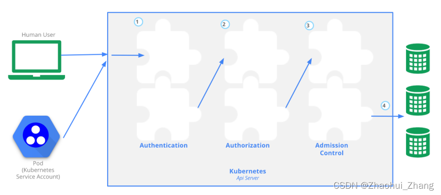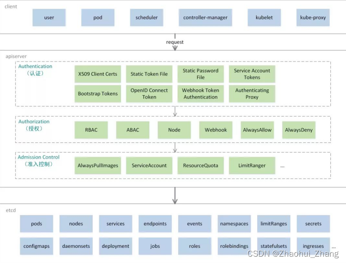 必须经过认证阶段,才到授权请求,根据所有授权策略匹配请求资源属性,决定允许或拒绝请求。授权方式现共有6种,AlwaysDeny、AlwaysAllow、ABAC、RBAC、Webhook、Node。默认集群强制开启RBAC。