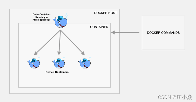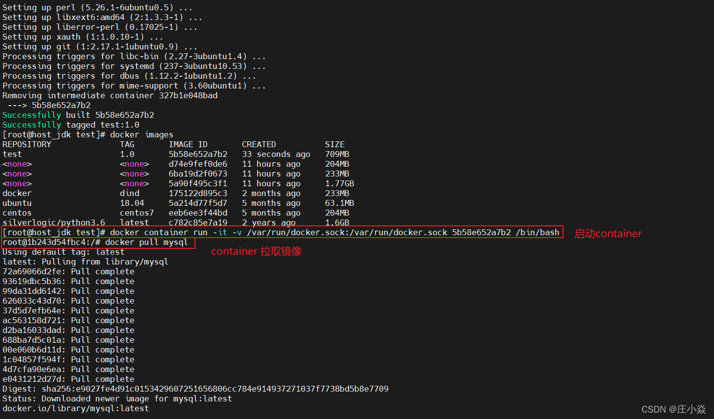 此方法实际上在容器内部创建一个子容器。仅当您确实要在容器中包含容器和镜像时才使用此方法。否则,我建议您使用第一种方法。为此,您只需要使用带有dind标签的官方docker镜像即可。该dind映像使用Docker所需的实用程序进行制作以在Docker容器中运行。