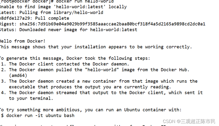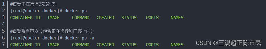 ?[root@docker docker]# docker ps -a CONTAINER ID ? IMAGE ? ? ? ? COMMAND ? ?CREATED ? ? ? ? STATUS ? ? ? ? ? ? ? ? ? ? PORTS ? ? NAMES a8412ff6e97a ? hello-world ? "/hello" ? 3 minutes ago ? Exited (0) 3 minutes ago ? ? ? ? ? ? distracted_chatelet [root@docker docker]# docker images REPOSITORY ? ?TAG ? ? ? IMAGE ID ? ? ? CREATED ? ? ? ?SIZE hello-world ? latest ? ?d1165f221234 ? 6 months ago ? 13.3kB