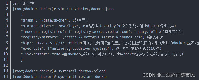 Server: Docker Engine - Community ?Engine: ? Version: ? ? ? ? ?20.10.8 ? API version: ? ? ?1.41 (minimum version 1.12) ? Go version: ? ? ? go1.16.6 ? Git commit: ? ? ? 75249d8 ? Built: ? ? ? ? ? ?Fri Jul 30 19:54:13 2021 ? OS/Arch: ? ? ? ? ?linux/amd64 ? Experimental: ? ? false ?containerd: #容器 ? Version: ? ? ? ? ?1.4.9 #容器版本 ? GitCommit: ? ? ? ?e25210fe30a0a703442421b0f60afac609f950a3? ?runc: 运行时容器 ? Version: ? ? ? ? ?1.0.1 ? GitCommit: ? ? ? ?v1.0.1-0-g4144b63 ?docker-init: #初始化 ? Version: ? ? ? ? ?0.19.0 ? GitCommit: ? ? ? ?de40ad0