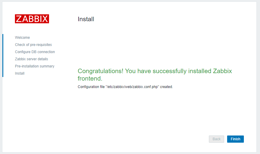 打开http:IP/zabbix       看到上述提示,说明安装成功。点"Finish"  默认 用户名:Admin,密码:zabbix