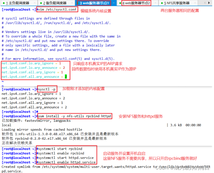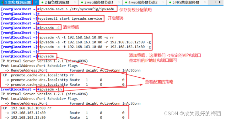 | 主负载调度器(Director1) | CentOS7 | ens33:192.168.163.10 | ipvsadm、keepalived | | 备负载调度器(Director2) | CentOS7 | ens33:192.168.163.11 | ipvsadm、keepalived | | Web节点服务器1 | CentOS7 | ens33:192.168.163.12 lo:0 (VIP):192.168.163.100 | rpcbind、nfs-utils、httpd | | Web节点服务器2 | CentOS7 | ens33:192.168.163.13 lo:0 (VIP):192.168.163.100 | rpcbind、nfs-utils、httpd | | NFS服务器 | CentOS7 | 192.168.163.14 | rpcbind、nfs-utils | | 客户机 | Windows10 | 192.168.163.15 |