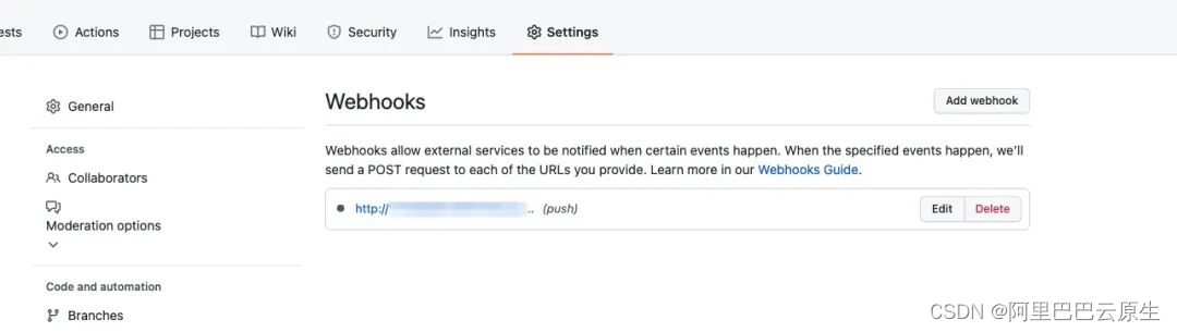 登陆 GitHub,在 GitHub 代码仓库“setting”中选择左侧“Webhooks”,选择新建 Webhook。