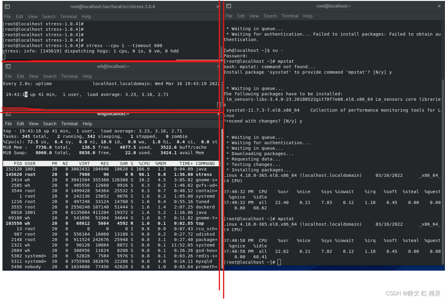 第第四个终端运行 mpstat 查看 CPU 使用率的变化情况(这里需要下载)