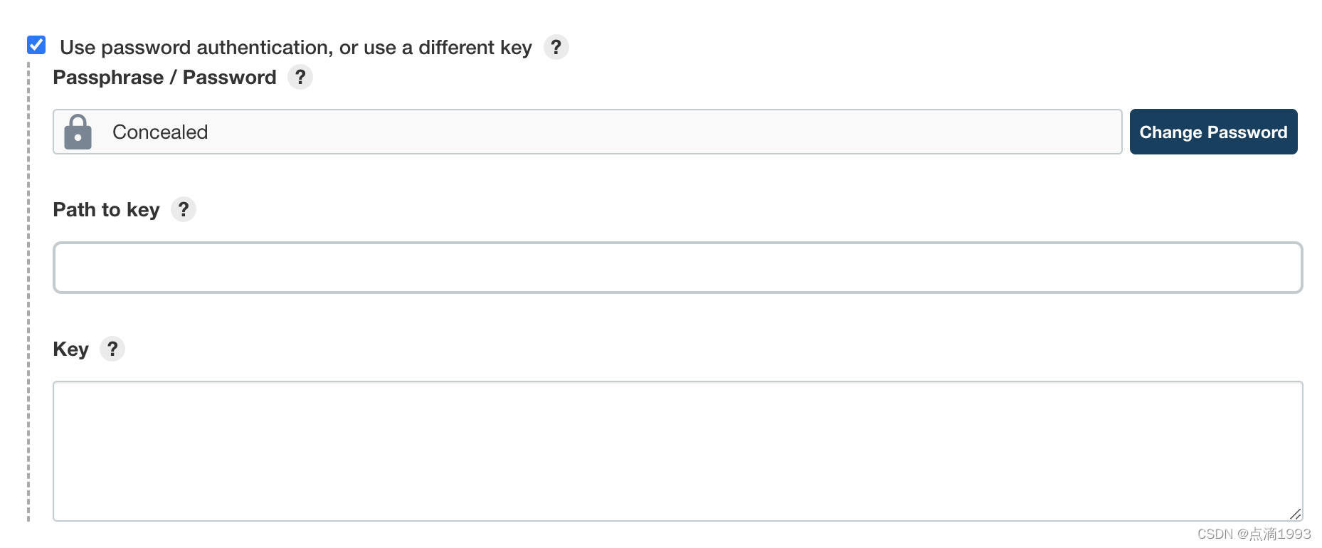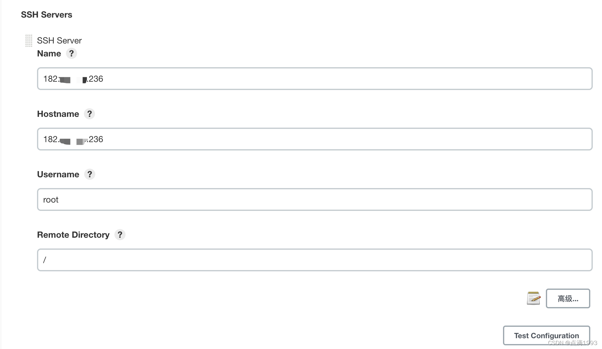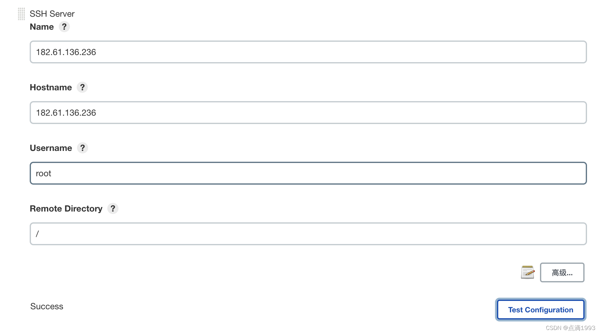 配置远程服务器的 SSH 信息,并点击「高级」按钮 之后。如下图所示: