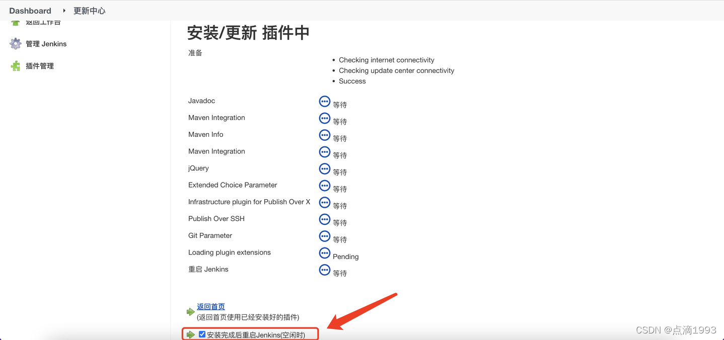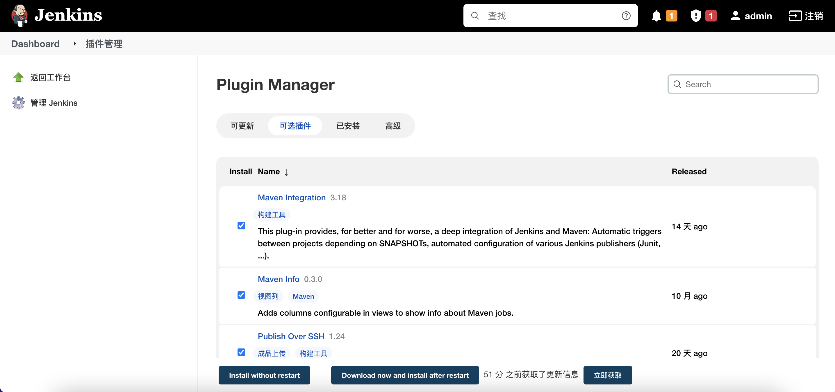 从 Jenkins 首页开始,按照「系统管理?-> 插件管理」的顺序,进入「插件管理」界面。如下图所示: