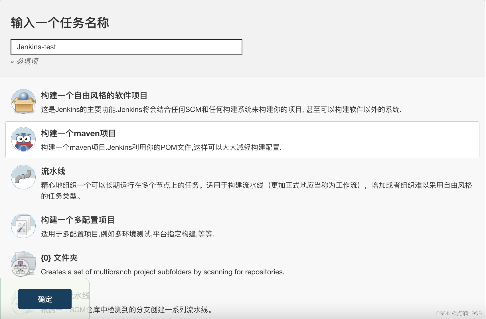 从 Jenkins 首页开始,点击「新建任务」按钮,进入 Jenkins 任务创建界面。输入任务名,并选择构建一个 Maven 项目。如下图所示: