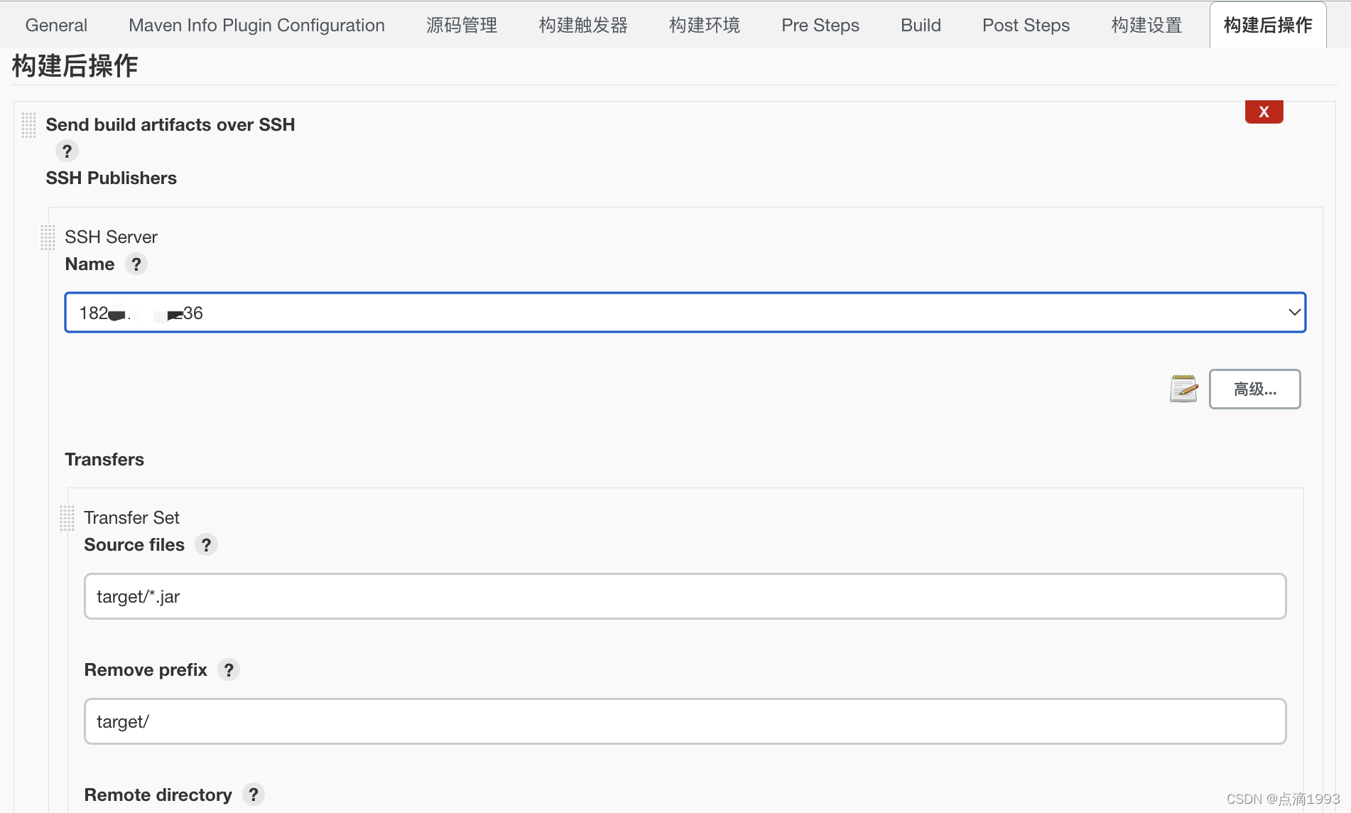 Remote directory 配置项:传输到远程服务器的目录。示例:/work/projects/jenkins-demo/build