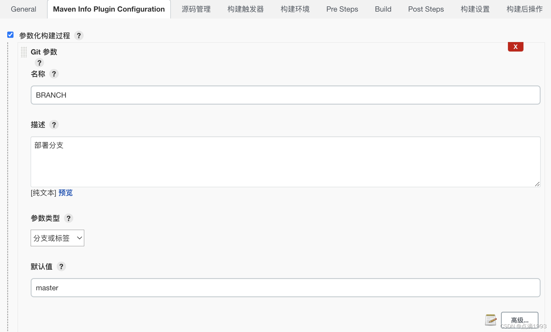参数化构建:这里使用 Git Parameter 插件,创建了参数名为?BRANCH,值为 Git 项目的 Branch/Tag。在后续的项目构建中,可以选择构建的 Git 项目的分支/标签。?