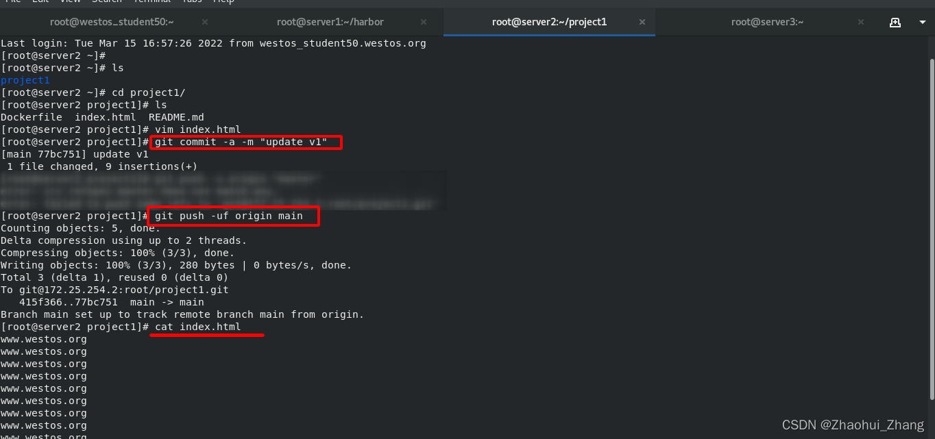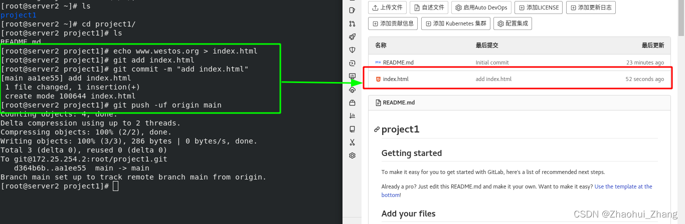 在server2中重新更改文件,并再次推送到gitlab,查看远端主机的运行结果。