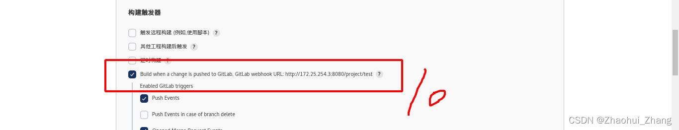 这就需要一个触发器,当gitlab发生改动时,将会主动通知jenkins的触发器,进而触发jenkins的同步机制。