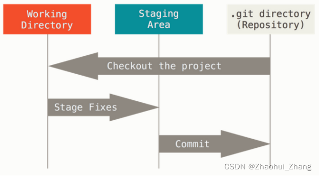 这会让我们的 Git 项目拥有三个阶段:工作区、暂存区以及 Git 目录。