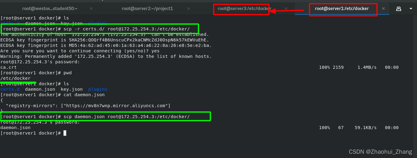 cp -r /etc/docker/certs.d/ /etc/docker/daemon.json root@172.25.254.4:/etc/docker/ //复制加速器及证书