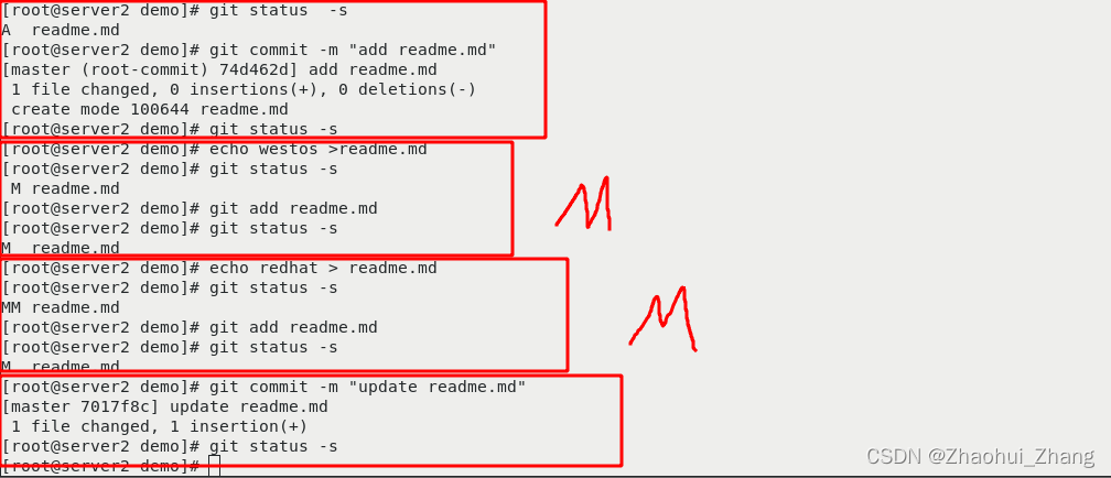 用户信息 | $ git config --global user.name "zzh" $ git config --global user.email “290637510@qq.com” | 检查当前文件状态 | $ git status $ git status -s?? ??? ?//简化输出 | 状态简览 | $ git status -s ? ????????A ?lib/git.rb? ? ? ? ? ? ? ? ?//暂存状态,待提交状态 ? ? ? ? ? ?M README? ? ? ? ? ?//已提交文件发生改动后未重新提交(M在右边) ????????M? ? README? ? ? ? ? ?//已提交文件发生改动后重新提交(M在左边) ????????MM? Rakefile ?????????? LICENSE.txt? ? ? ? //新建的文件未槽作过的状态 M在右边表示在工作区,M在左边表示在暂存区 | 跟踪新文件 | ?git add README | 忽略文件 | $ cat .gitignore ????????.*?? ??? ?//忽略所有隐藏文件 ????????/test?? ??? ?//只忽略当前目录下的test文件 ????????build/?? ??? ?//忽略任何目录下名为 build 的文件夹 | 查看已暂存和未暂存的修改 | git diff | 提交更新 | git commit | 跳过使用暂存区域 | git commit -a -m 'added new benchmarks' | 移除文件 | $ git rm PROJECTS.md $ git rm --cached README | 重命名文件 | $ git mv README.md README 其实,运行 git mv 就相当于运行了下面三条命令: ???????? $ mv README.md README ???????? $ git rm README.md ? ? ? ? ?$ git add README | 查看提交历史 | $ git log $ git log -p -2 $ git log --stat $ git log --pretty=oneline | 取消暂存的文件 | $ git reset HEAD README.md | 撤消对文件的修改 | $ git checkout -- README.md | 版本回退: | $ git reflog $ git reset --hard efa267a |