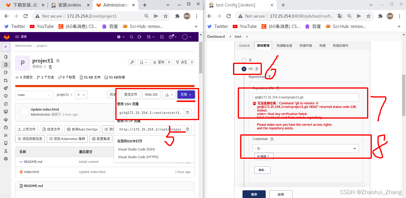 注意:jenkins是以git的方式访问gitlab,因此jenkins的客户端必须先安装<yum install -y git>