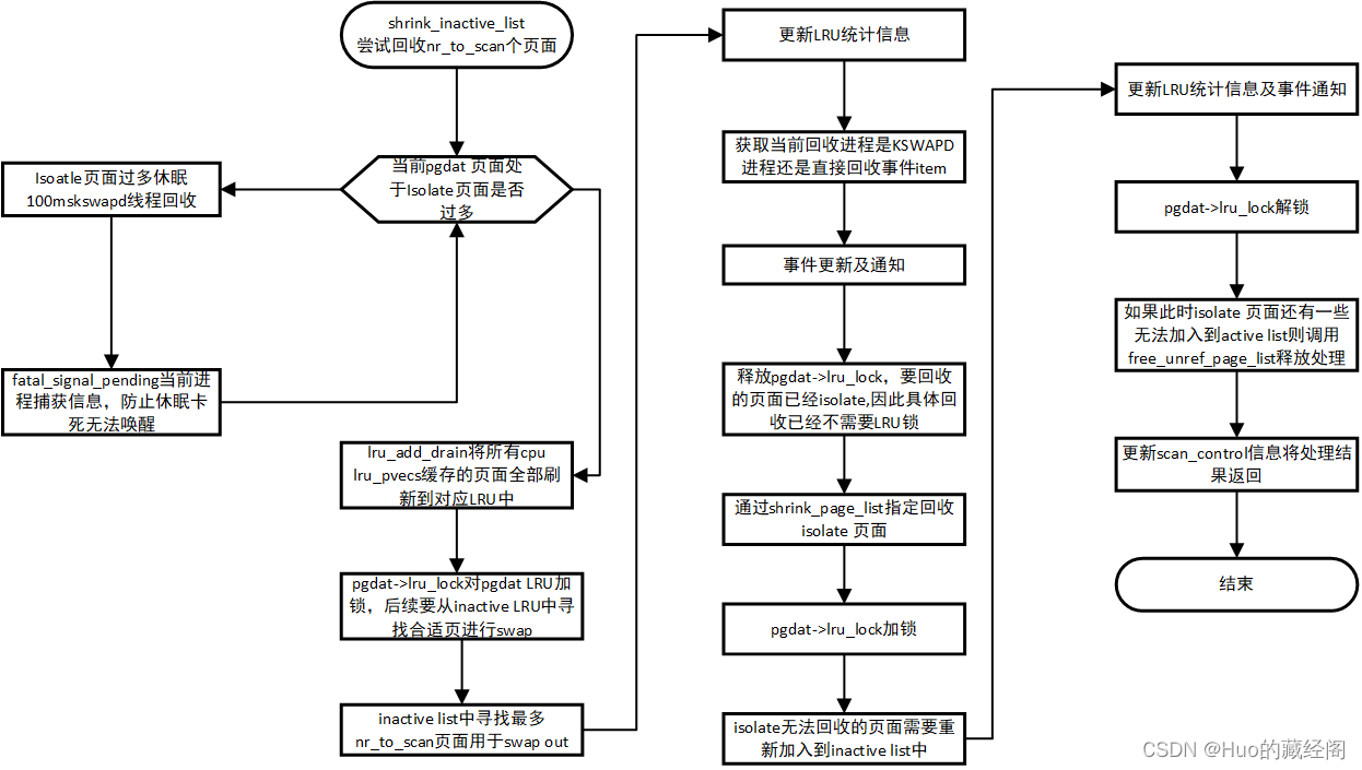 - isolate_lru_pages: 将从指定的LRU list中,从链表尾部开始扫描,孤立出满足要求的nr_to_scan个页面(大部分情况下 page都会孤立出来),将其从原有LRU链表中摘除,并保存到page_list链表中。