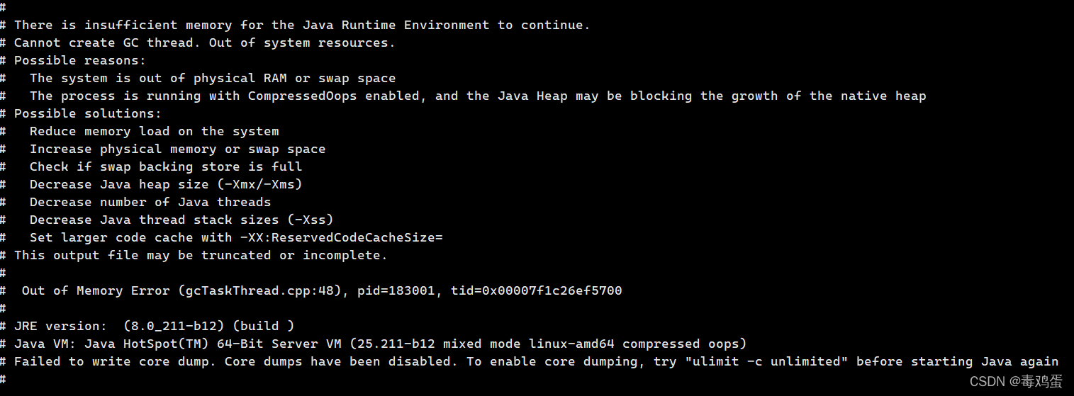 在服务器测试流程时,出现了JAVA 程序内存不够 的问题,但经过测试后,发现内存及CPU空闲较多。 查看程序日志发现有unable to create new native thread类似无法创建线程的报错 内存及CPU空闲较多,资源充足排除内存不足的影响,只能怀疑是哪里限制了最大线程数.