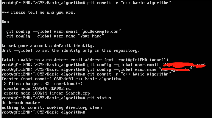 但是命令执行失败,根据提示得知需要先设置你github的邮箱和用户名,在执行命令即可