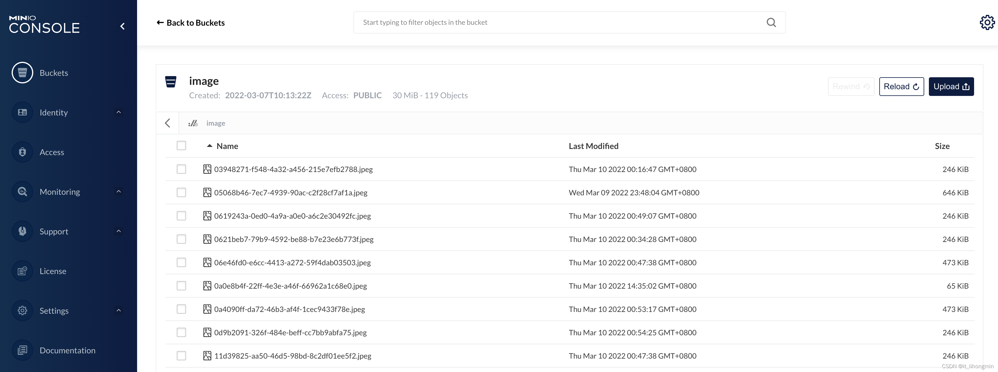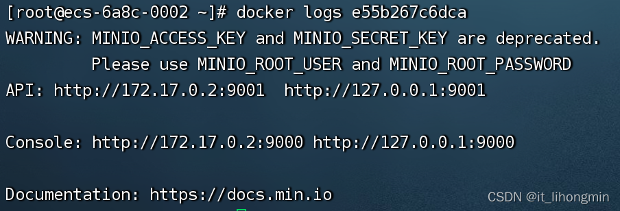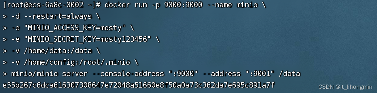 启动minio,由于minio会创建动态的端口,并且外网不能进行访问,所以使用以下命令(其中 9000是 web的端口,9001的api的端口,新版本 java sdk不能使用 9000web端口):