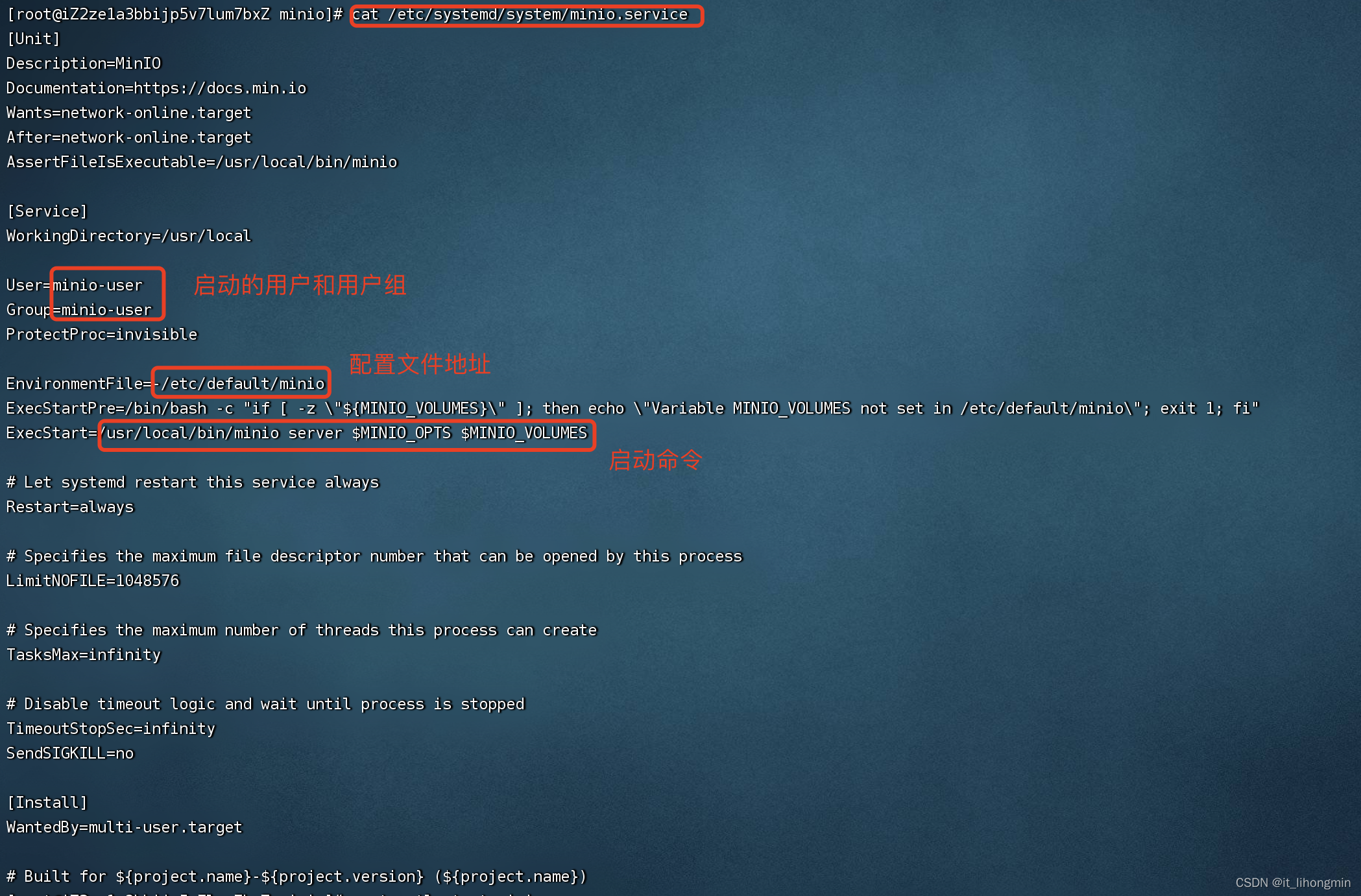其他rpm包此时就可以使用 systemctl start minio进行启动了,只是此时不能进行启动需要修改 /etc/systemd/system/minio.service文件,将linux的用户名和group修改(可以修改为 root root)