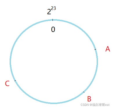 在一致性哈希算法中,需要对服务器进行计算,还是之前的三个服务器A、B、C,对于每个服务器都hash(服务器Ip地址)%2^32,然后将服务器对应到hash环上。
