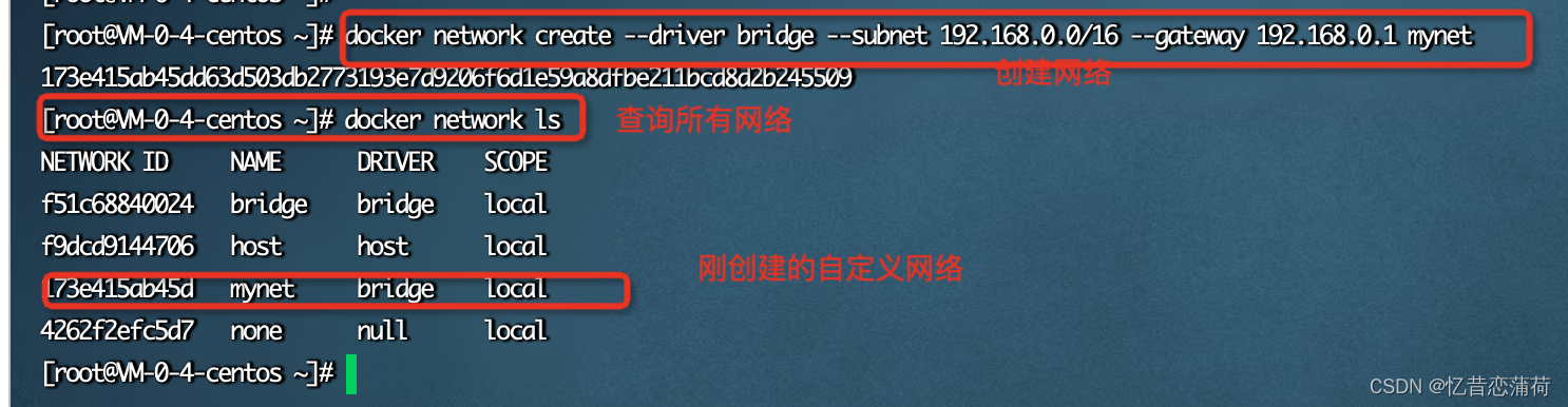 # docker network create --driver 网络模式 --subnet ip和子网掩码 --gateway 网关 自定义网络名