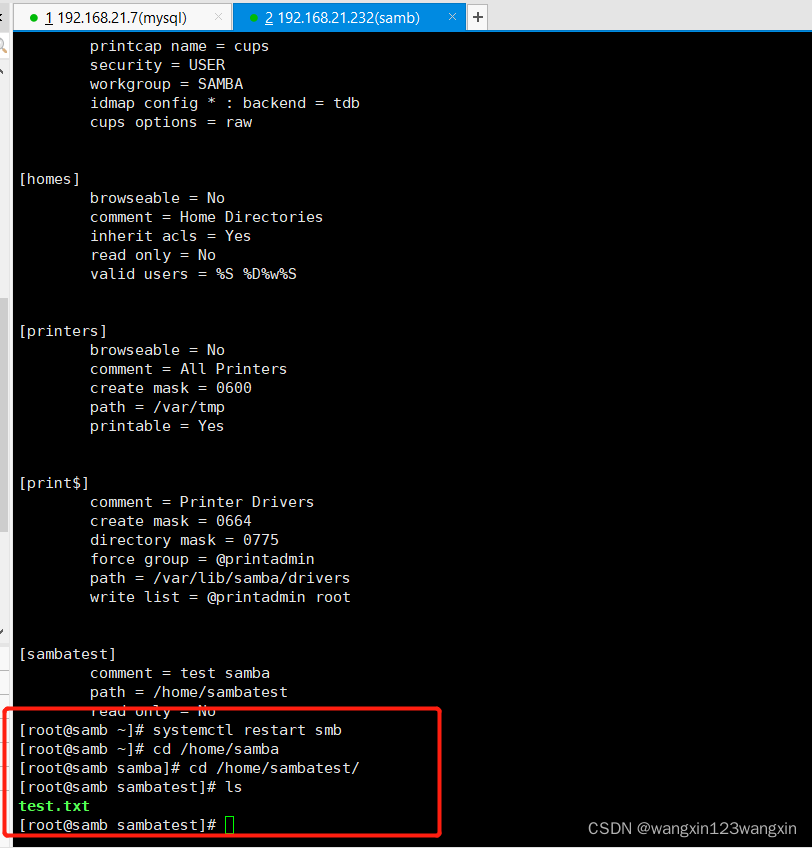 连接测试:smbclient //192.168.21.232/sambatest -U sambatest
