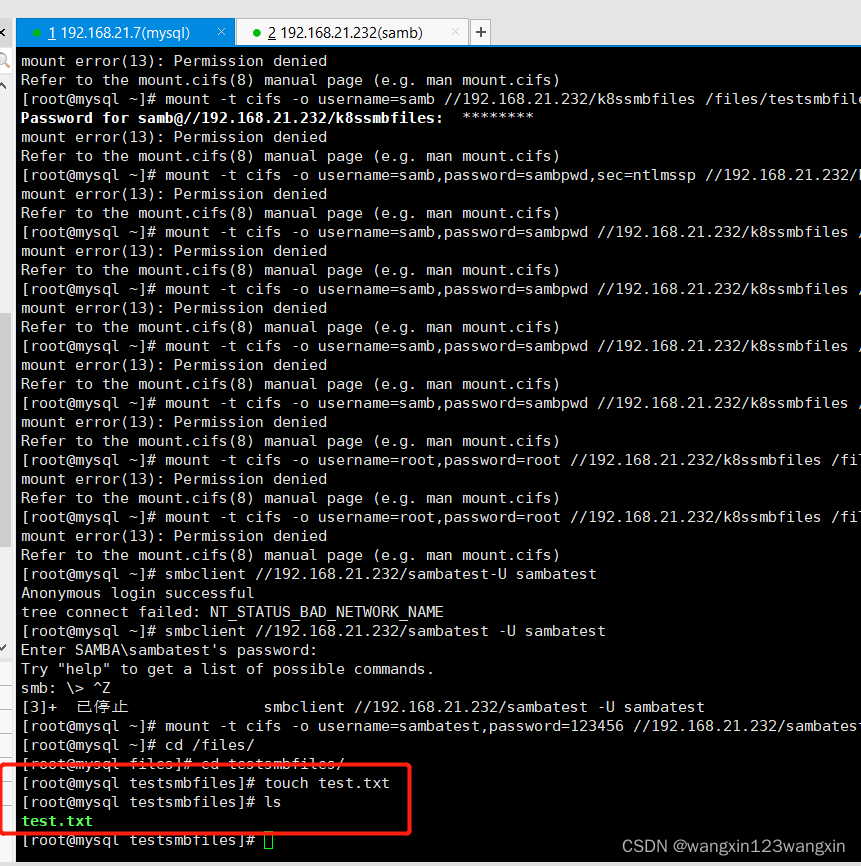 mkdir -pv /files/testsmbfiles mount -t cifs -o username=sambatest,password=123456 //192.168.21.232/sambatest /files/testsmbfiles 在客户端创建一个文件