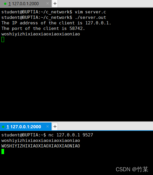 下面是不写客户端就可以测试的方法。先用XShell打开另外一个Linux命令行,执行nc 127.0.0.1 9527命令,9527是我们赋给SERV_PORT常量的值,也可以是其他的,不过代码就要相应地做出更改。这样就可以直接在命令行中输入小写字母序列,命令行会打印对应的大写字母。