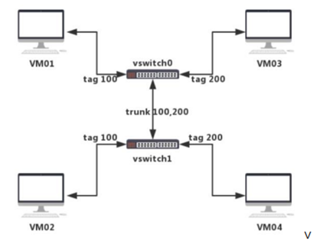 ?结果应为同vlan相同,不同vlan不同,vm1和vm2通,和vm3,4不通