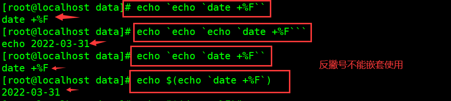 - 反撇号` `:反撇号和$()一样,引号或括号里的命令会优先执行,如果存在嵌套,反撇号不能用