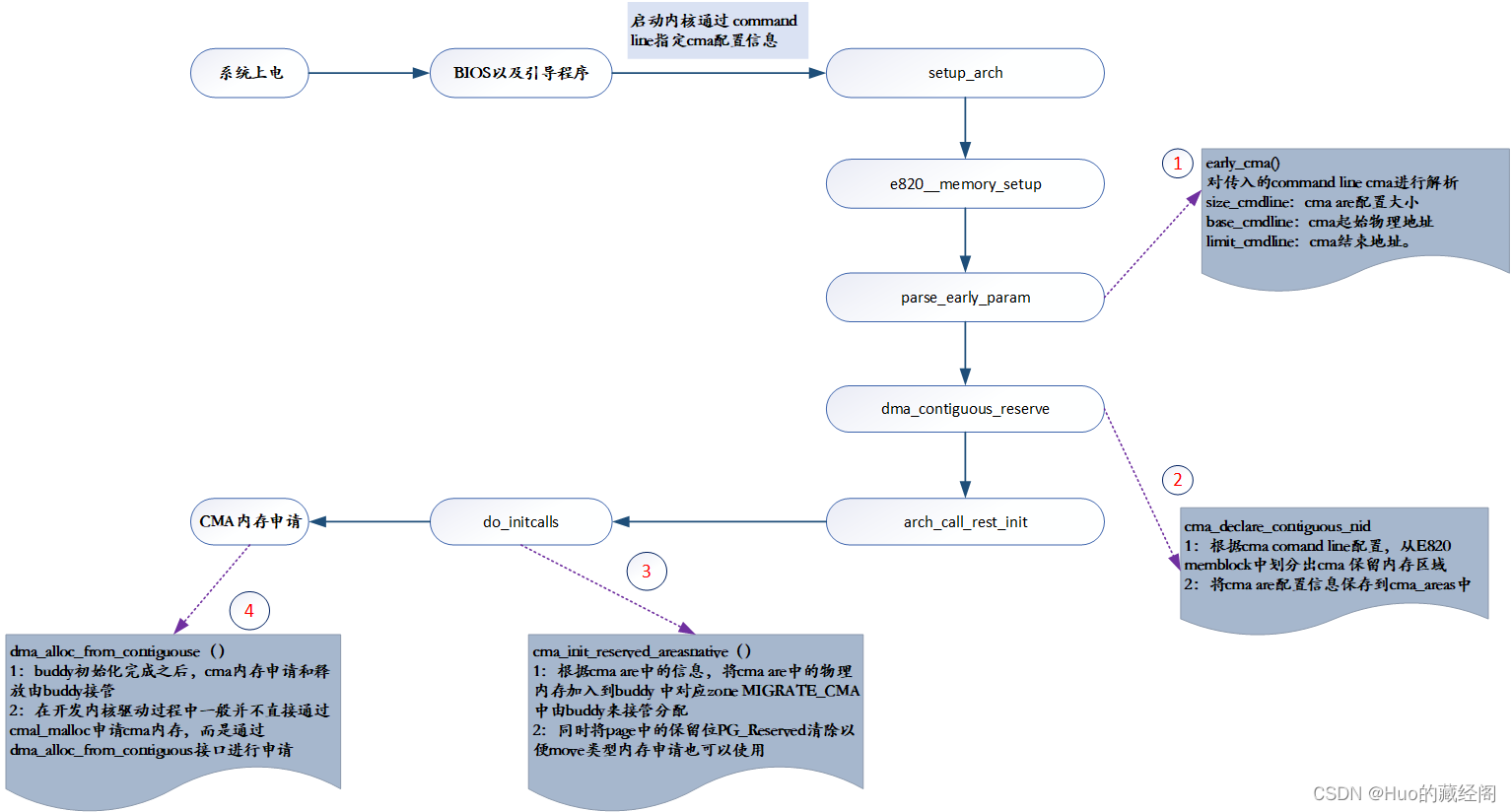 - 之后根据解析出的cma 信息,cma_declare_contiguous_nid用于从E820 memblock中划分出满足要求的物理内存用于保留cma区域。