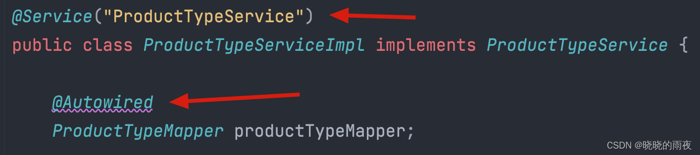 监听器中要获得的是 ProductTypeService 业务层的这个bean,也就是ProductTypeServiceImpl的上层接口。由于监听器过早的生效时间导致我们自动注入的bean的引用名称还没有生效(实际上bean已经注入了,但是监听器此时识别不到,小写类名首字母也没有用),这时候就要用到自定义bean名称了!