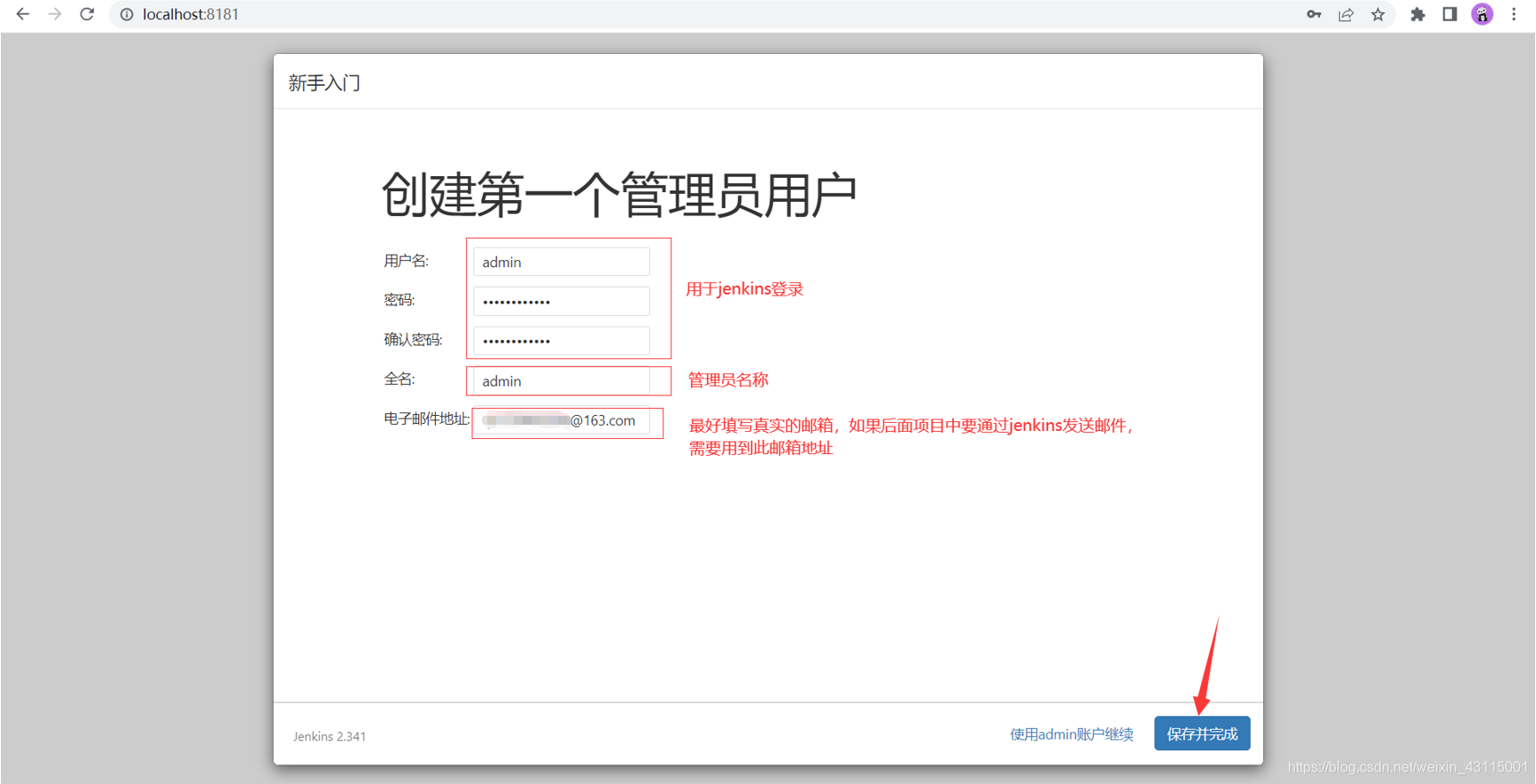 插件安装完成后,需要创建管理员用户,如下图;  -
