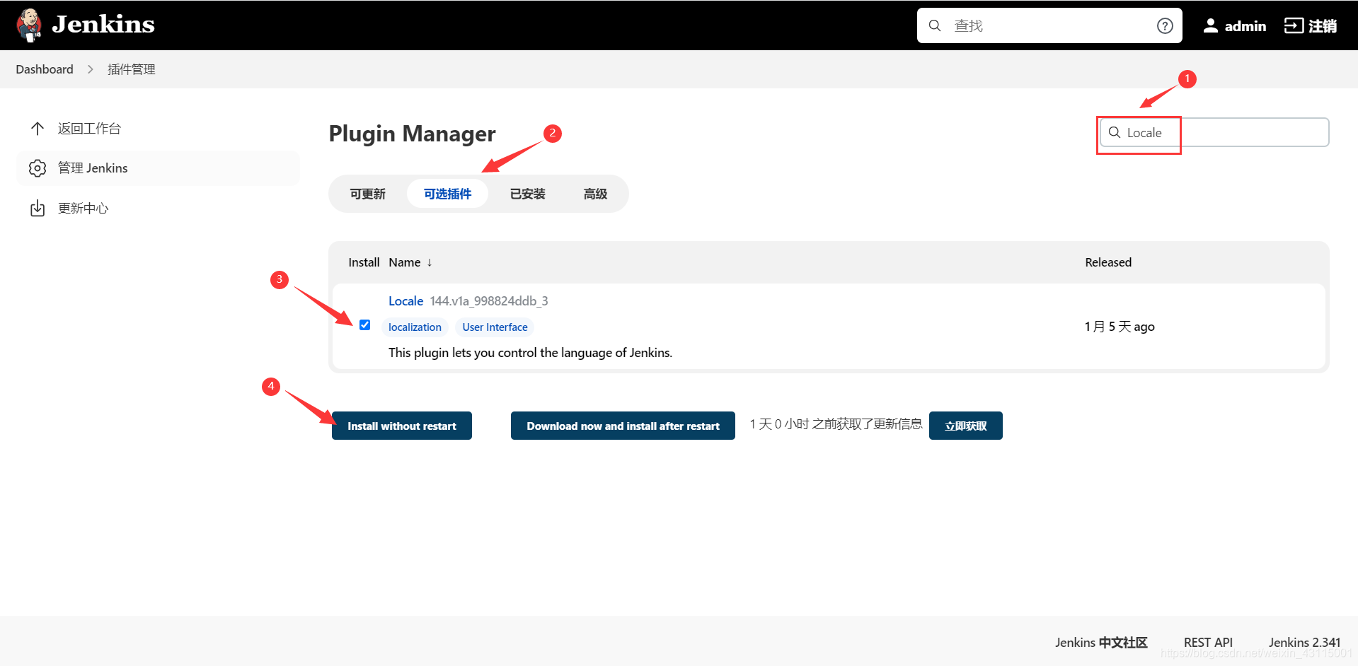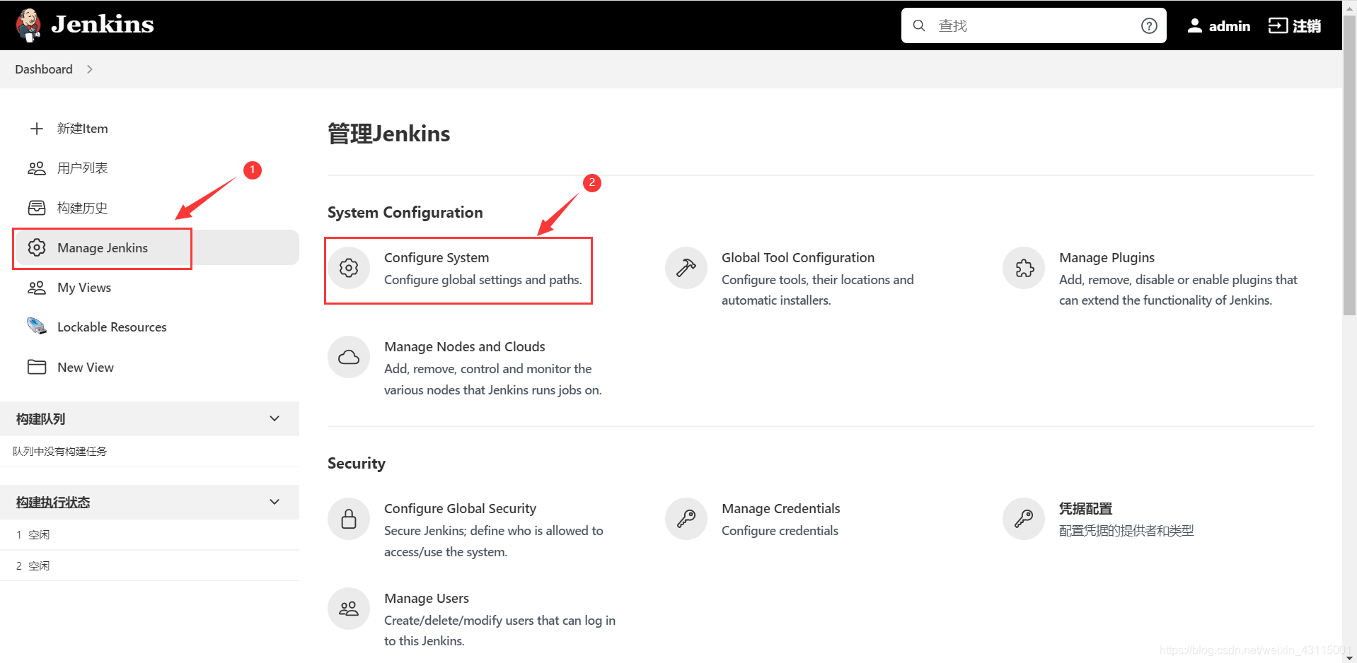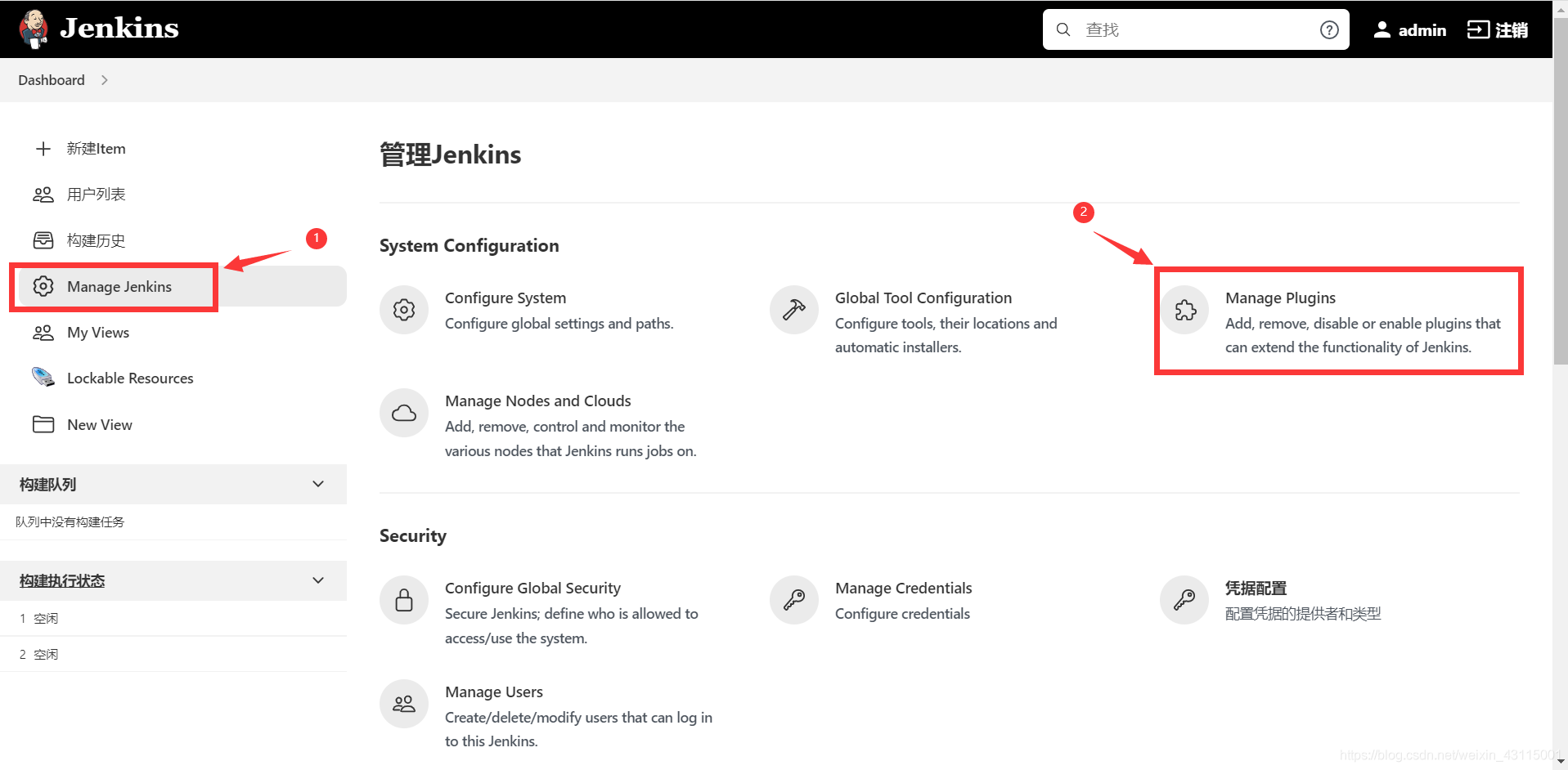 1. Jenkins中文设置 ①依次点击【Manage Jenkins】→【Manage Plugins】,进入到插件管理页面;  ②切换到【可选插件】tab,并搜索插件名Locale plugin ,若搜索后存在则点击安装,若搜索后不存在,则切换到【已安装】tab,看看该插件是否已经安装了;  ③安装中文(简体中文)汉化语言包插件Localization: Chinese (Simplified) ;  ④依次点击【Manage Jenkins】→【Configure System】,进入到系统配置页面;  ⑤找到【Default Language】(注:必须先安装Locale plugin插件,否则无法找到该选项),设定简体中文,输入zh_CN ;