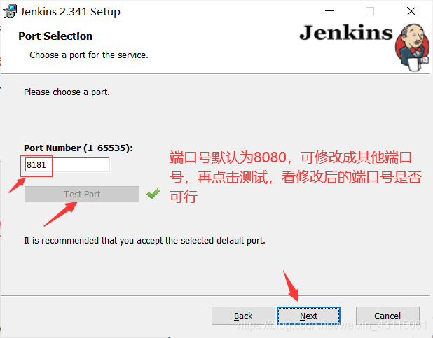 ①我这里选择"Run service as LocalSystem(not recommended)“,然后点击“Next”即可; ②如果选择"Run service as local or domain user”,可参考:https://blog.csdn.net/qq_27696623/article/details/121636342  - 端口号设置,因为端口号默认为8080,考虑到该端口号可能会被其他服务占用,故建议修改此端口号。比如我这里改为了8181,再点击“Test Port”,如果有个绿色的√出现(表示端口号可行),再点击Next;