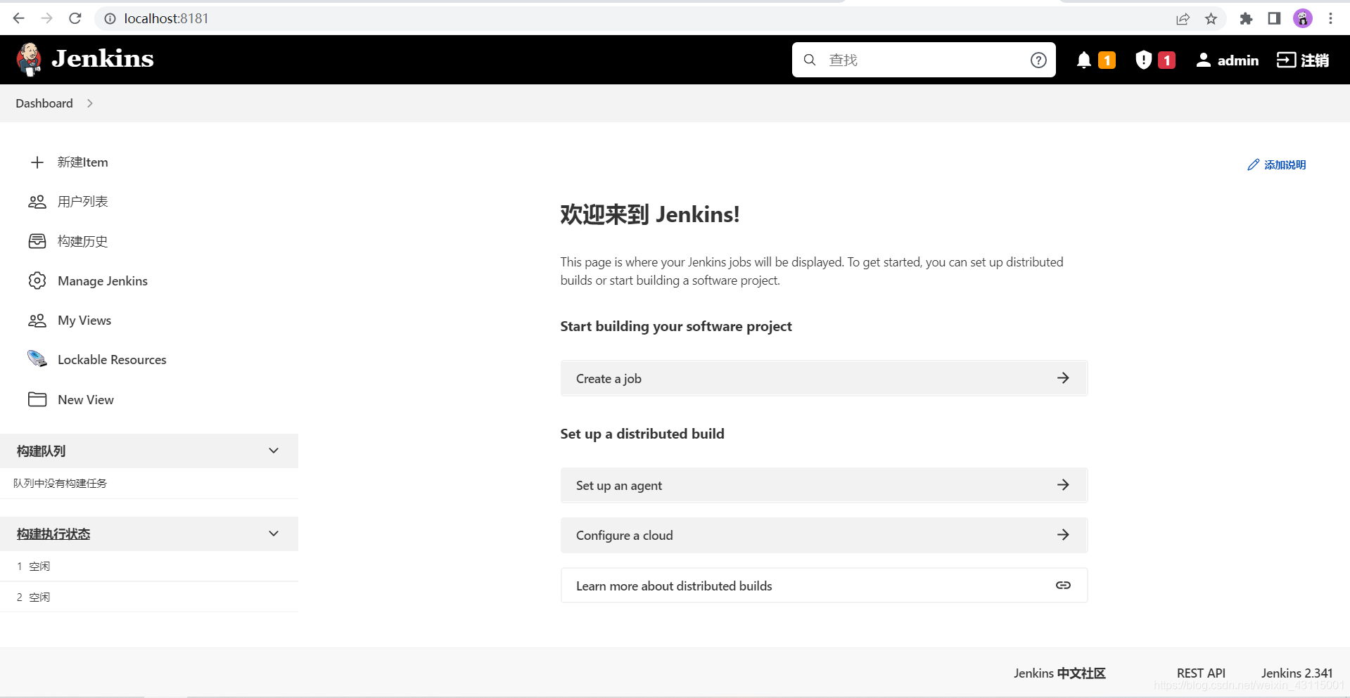 若成功进入到Jenkins首页页面,Jenkins安装配置到此完成!