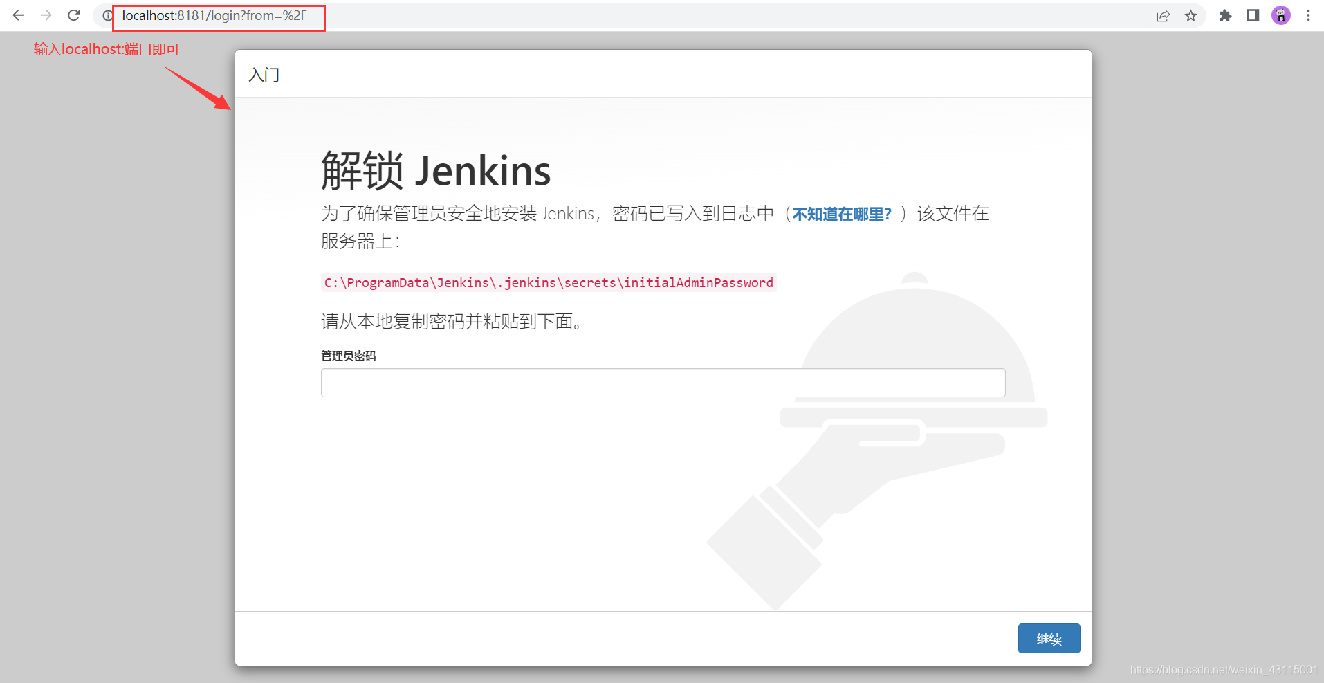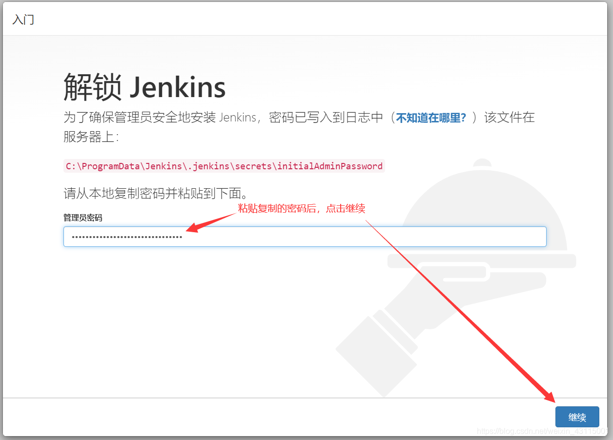 将复制的密码粘贴到管理员密码输入框中,并点击继续;  -