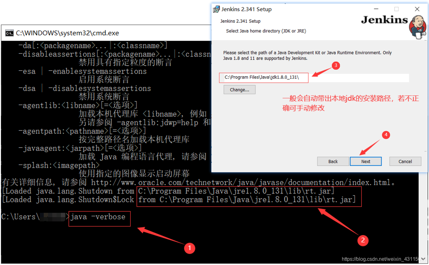 java -verbose ,返回结果的最后两行即为本地jdk安装路径。  - 自定义设置,点击Next;