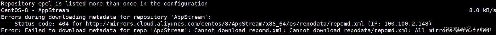 - Status code: 404 for http://mirrors.cloud.aliyuncs.com/centos/8/AppStream/x86_64/os/repodata/repomd.xml (IP: 100.100.2.148)