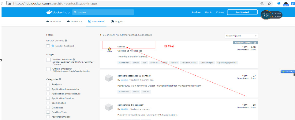 docker search命令,也可以查询到镜像仓库的镜像名,但是看不到标签名,所以我们这里来官网看仓库中有哪些centos的版本。